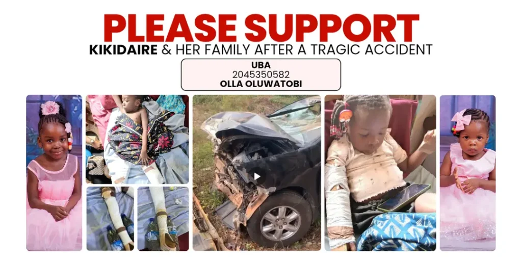 In the early hours of 1st of January, a tragic accident changed the lives of a young family forever. Kikidaire, a bright and joyful child who will turn 7 in February, was involved in a serious road accident alongside her parents, sister, and aunt while returning home. Sadly, her mother did not survive due to internal injuries sustained from the impact.